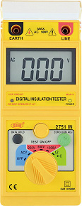 Принцип действия измерителя сопротивления изоляции 2751 IN основан на измерении падения напряжения на сопротивлении изоляции под действием тока, возникающего при приложении испытательного высокого напряжения, с последующим преобразованием в пропорциональное значение сопротивления. Измеритель 2751 IN выполнен с использованием аналого-цифрового преобразователя и выводом результата измерений в цифровом виде. Измеритель 2751 IN выполнен в прямоугольном пластмассовом корпусе переносного исполнения с батарейным питанием и снабжены специальными выносными проводами. На передней панели 2751 IN расположены индикаторы и органы управления. Гнезда для подключения измерительных кабелей расположены на на верхней панели.